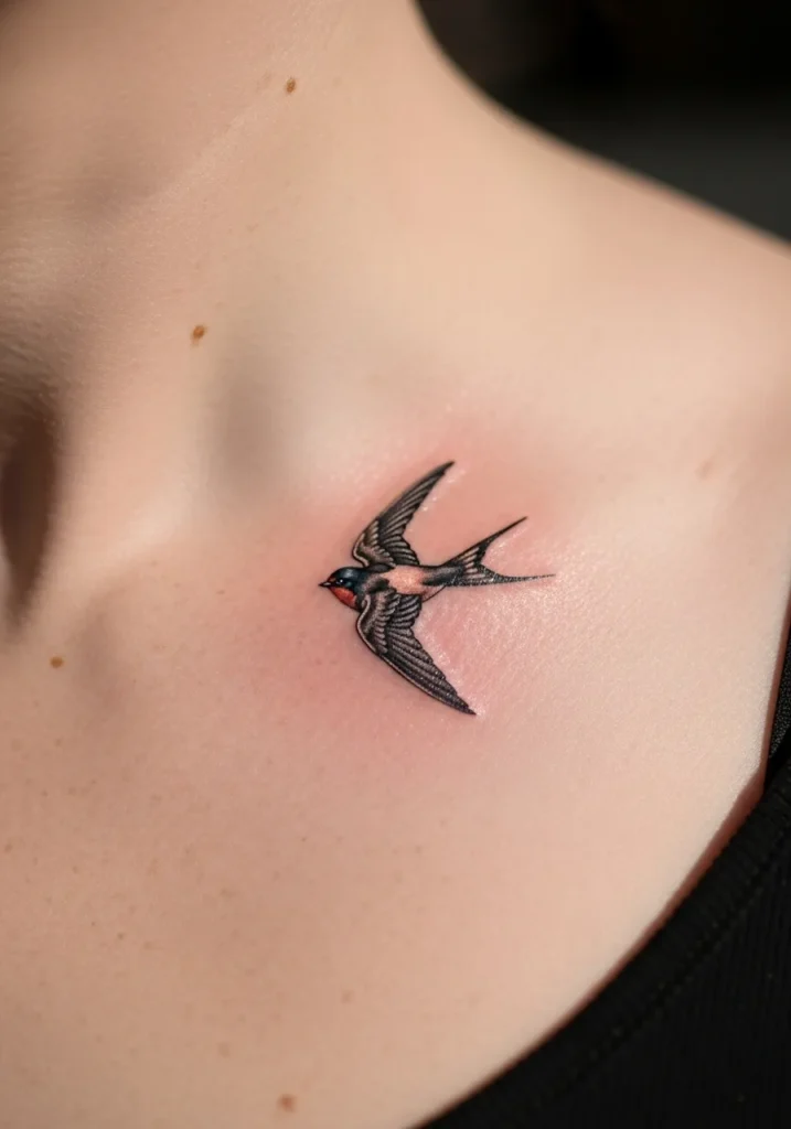 This micro realism swallow tattoo is placed just below the collarbone, with detailed wings in soft black and grey tones and a pop of warm red on the chest. The bird looks mid-flight, frozen in graceful motion.