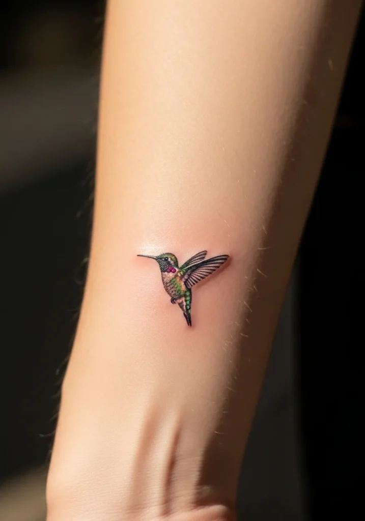 This tiny hummingbird tattoo hovers gracefully on the forearm, inked with shimmering greens, purples, and golds that make it look alive. The precision in the feathers and wings adds a stunning level of realism.