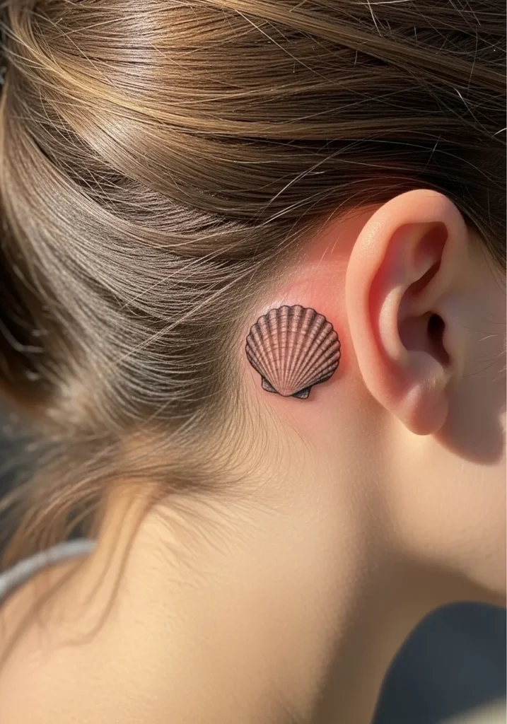 This small seashell tattoo rests delicately behind the ear, shaded in soft beige and brown hues that mimic real shell texture. The curved lines and fine details create a 3D effect that looks beautifully natural against the skin. Its petite size and placement make it subtle yet stylish, like a tiny secret nod to the sea.