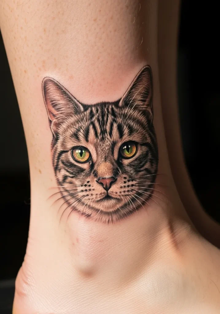 This micro realism cat tattoo captures a lifelike feline face right on the ankle. Every detail shines—from the glint in the cat’s green eyes to the soft stripes running across its fur. The warm brown and grey tones make the design look photographic, while the size keeps it tastefully minimal.