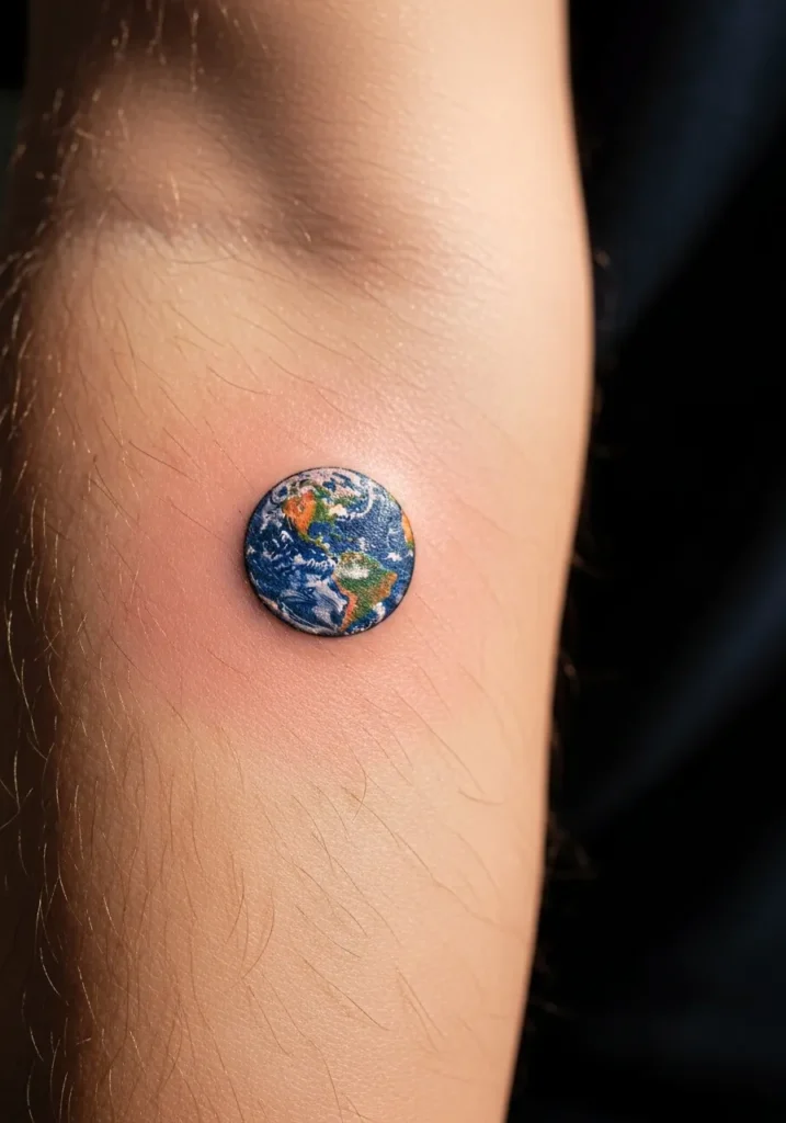 This tiny globe tattoo on the inner arm looks like a real photograph of Earth. The blue oceans, swirling clouds, and hints of green continents are shaded to perfection, all packed into a circular micro design. Its small size doesn’t stop it from feeling grand—like holding the whole world on your skin.