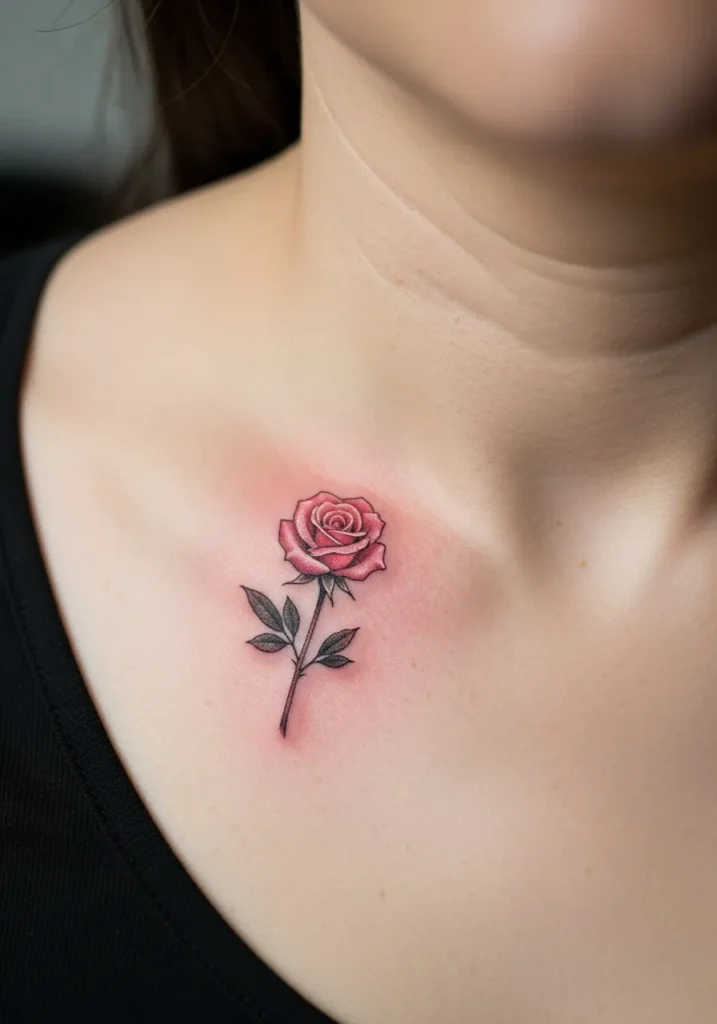 This small rose tattoo sits just above the collarbone, inked in a soft red hue with green leaves and a slender stem. The shading gives it a fresh, almost velvety appearance, while the placement adds a feminine touch. It’s dainty, realistic, and effortlessly romantic.