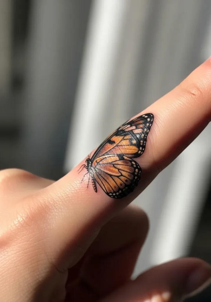 This tiny butterfly tattoo rests gently on the finger, its orange and black wings detailed with perfect symmetry and soft highlights. The design is so realistic it seems ready to flutter off at any moment. The scale and placement make it delicate and full of personality.