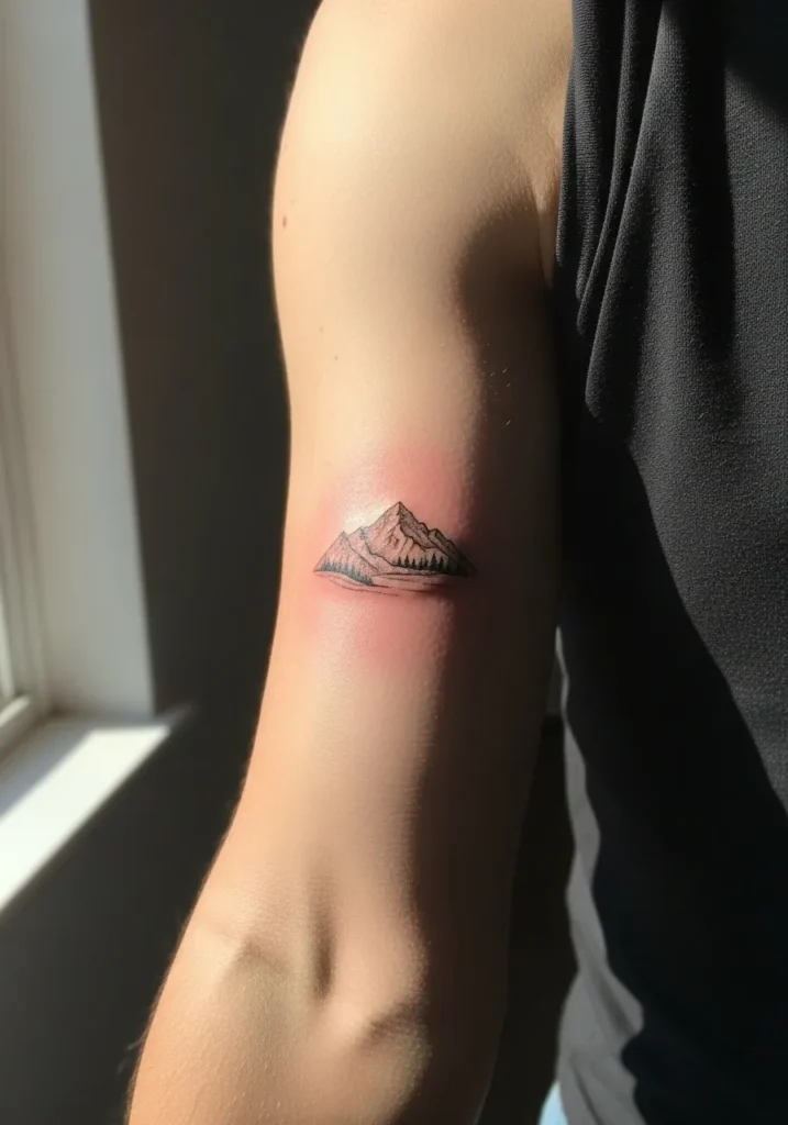 This micro realism tattoo shows a detailed mountain peak surrounded by trees, placed perfectly on the back of the arm. The crisp linework and subtle shading give the scene depth, while the minimal size keeps it clean and simple. The use of soft highlights makes the snowy summit stand out beautifully against the skin.