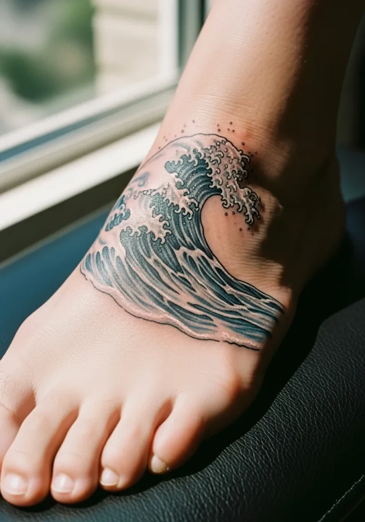 This realistic ocean wave tattoo curls gracefully across the top of the foot, featuring deep blue tones and white highlights that make it look like it’s in motion. Every ripple and foam detail is inked with precision, creating a beautiful balance of energy and flow.