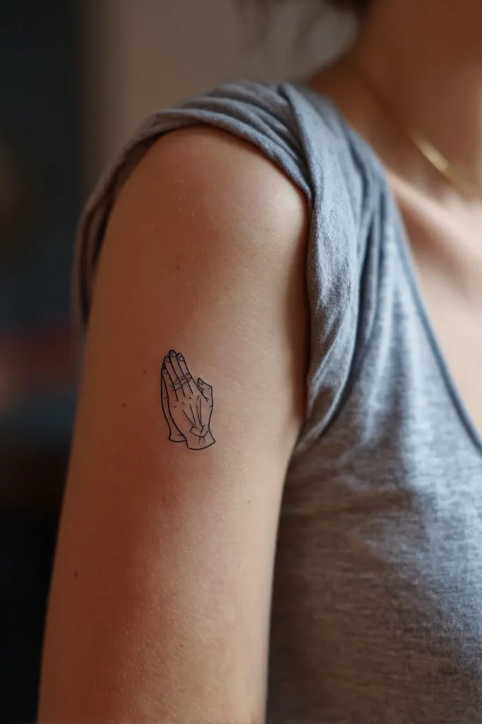 This tiny praying hands tattoo is placed on the upper arm, slightly toward the back, creating a subtle and intimate look. The design is done in fine black linework, outlining the hands with delicate detail while keeping the overall shape clean and uncluttered. It is small in size, with soft line accents to show the fingers and gentle folds without heavy shading. The minimalist style gives it a modern edge while still honoring the traditional symbolism.
