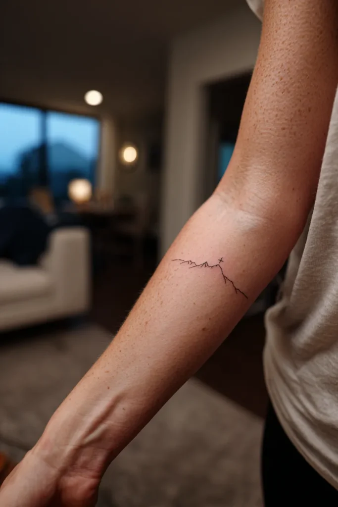 This minimalist tattoo is placed along the outer forearm, following the natural curve of the arm in a soft horizontal line. The design features a delicate single line mountain range with a tiny cross resting near one of the peaks. It is done in ultra fine black ink with slightly uneven strokes that give it a hand drawn, organic feel. The size is small to medium, keeping it subtle and modern while still allowing the mountain silhouette to be clearly recognizable.