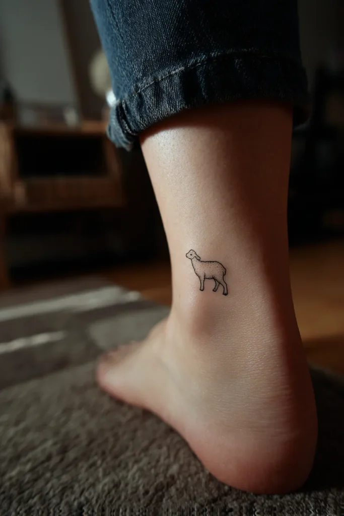 This minimalist lamb tattoo is placed just above the ankle bone, creating a soft and subtle look that feels both delicate and meaningful. The design is done in fine black linework with light detailing to suggest the wool texture while keeping the overall shape clean and simple. It is small in size, almost like a tiny illustration resting gently on the skin. There is no heavy shading or bold contrast, which keeps the tattoo modern and effortlessly calm.