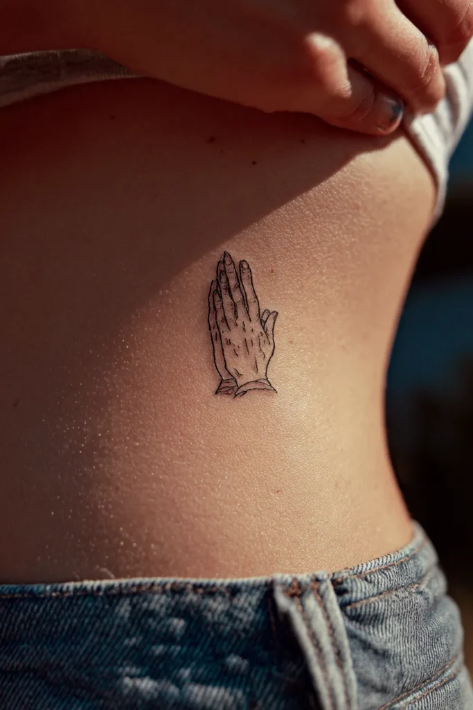 This delicate praying hands tattoo is placed softly along the side of the ribcage, making it feel intimate and personal. The design is small and finely lined, created in simple black ink with subtle detailing on the fingers to give it a gentle, hand drawn look. The lines are thin and clean, with no heavy shading, which keeps the whole piece light and modern. Its petite size makes it easy to hide or reveal depending on what you are wearing, adding to that minimalist charm.