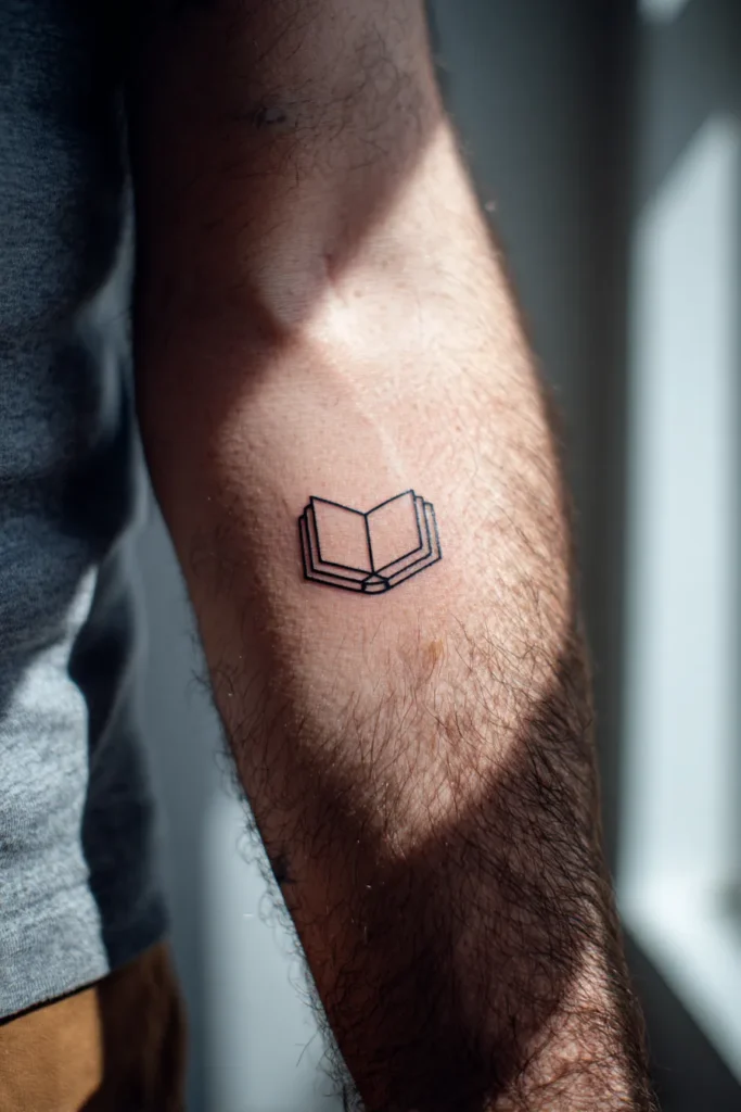 This small linework tattoo features a simple open Bible design placed on the inner forearm. The lines are clean and evenly spaced, creating a balanced outline of layered pages without any shading or extra detail. The size is modest, sitting comfortably in the center of the forearm, and the black ink contrasts softly against natural skin with visible hair and texture. The design feels modern and graphic, almost like a tiny symbol rather than a detailed illustration.