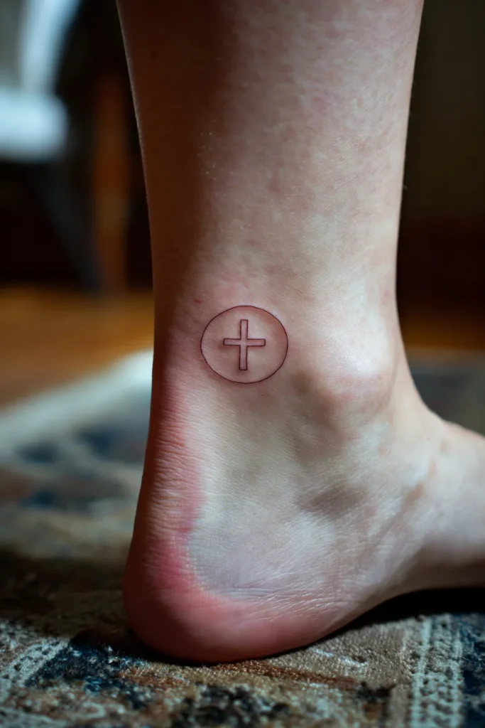 This delicate ankle tattoo features a small cross centered within a thin circular outline. The design is perfectly symmetrical and minimal, with soft black ink that looks slightly pink around the edges as if freshly done. The placement just above the heel bone gives it a discreet and feminine feel. The circle adds structure while keeping the overall look light and modern.