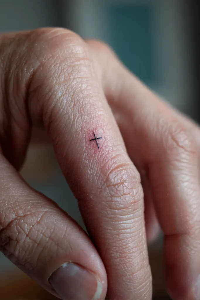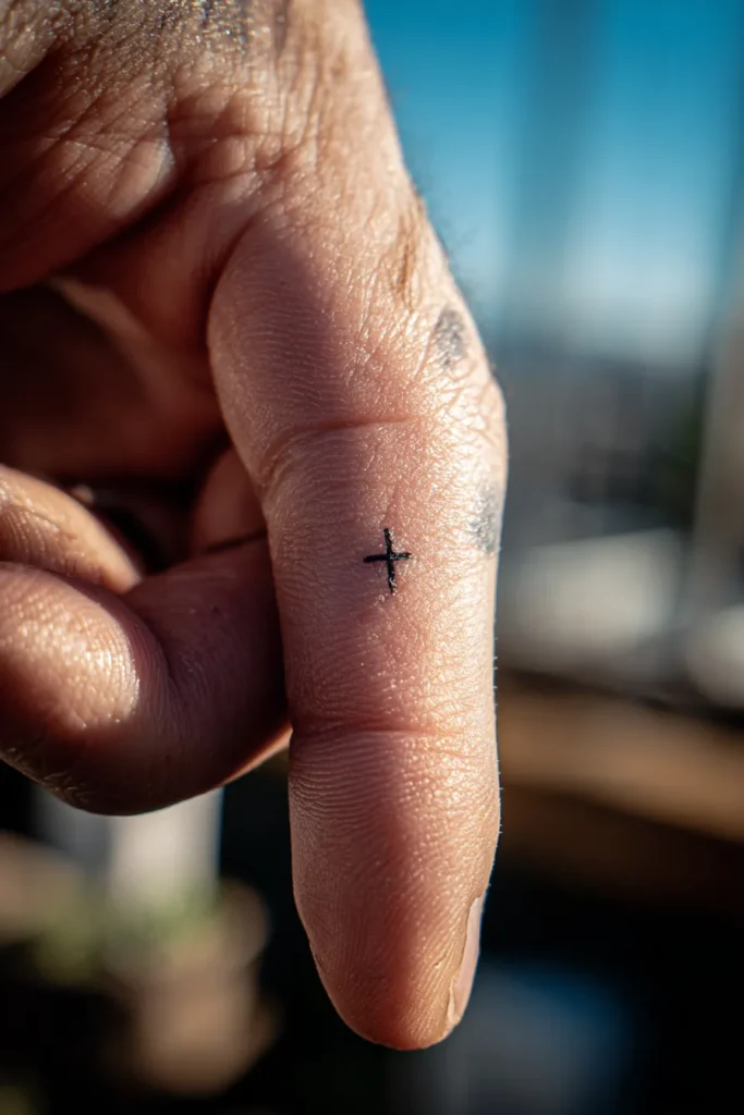 This micro cross tattoo is placed on the side of the finger near the knuckle, done in very fine black lines. The design is incredibly small and simple, with slight natural redness around the ink that hints at a fresh session. The placement makes it feel almost like jewelry, subtle but noticeable when the hand moves. The skin texture and fine lines of the finger add to its raw, real look.