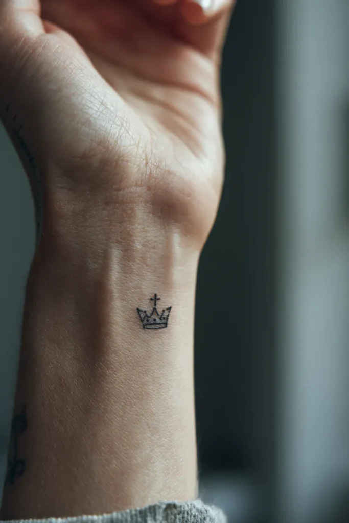 This small fine line crown sits delicately on the inner wrist, drawn in thin black ink with clean, precise detailing. A tiny cross rises subtly from the top center of the crown, giving it a clear Christian meaning without overwhelming the minimalist look. The size is petite and refined, resting neatly between the wrist bones, and the lines are light enough to feel modern while still defined. The soft natural skin texture around it makes the design feel grounded and real.