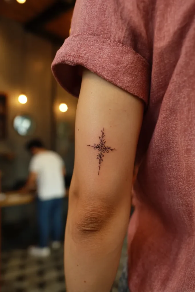 This delicate cross tattoo is placed on the upper arm, slightly above the inner elbow, making it feel subtle yet intentional. The design is done in fine black linework with clean, balanced proportions and a faint ornamental touch at the ends of the cross. It is small in size, almost dainty, and sits beautifully against the skin without overpowering the space. The simplicity of the lines gives it that calm and modern vibe that minimalist lovers adore.