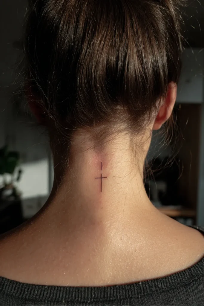 This minimalist cross is placed at the center of the nape, perfectly aligned with the spine. The design is ultra simple, made of two thin black lines intersecting cleanly, with a slight pink tint around the ink that suggests a fresh session. Its vertical placement enhances the natural lines of the neck, making it feel intentional and elegant. The size is small yet noticeable when the hair is up, giving it that quiet reveal effect.