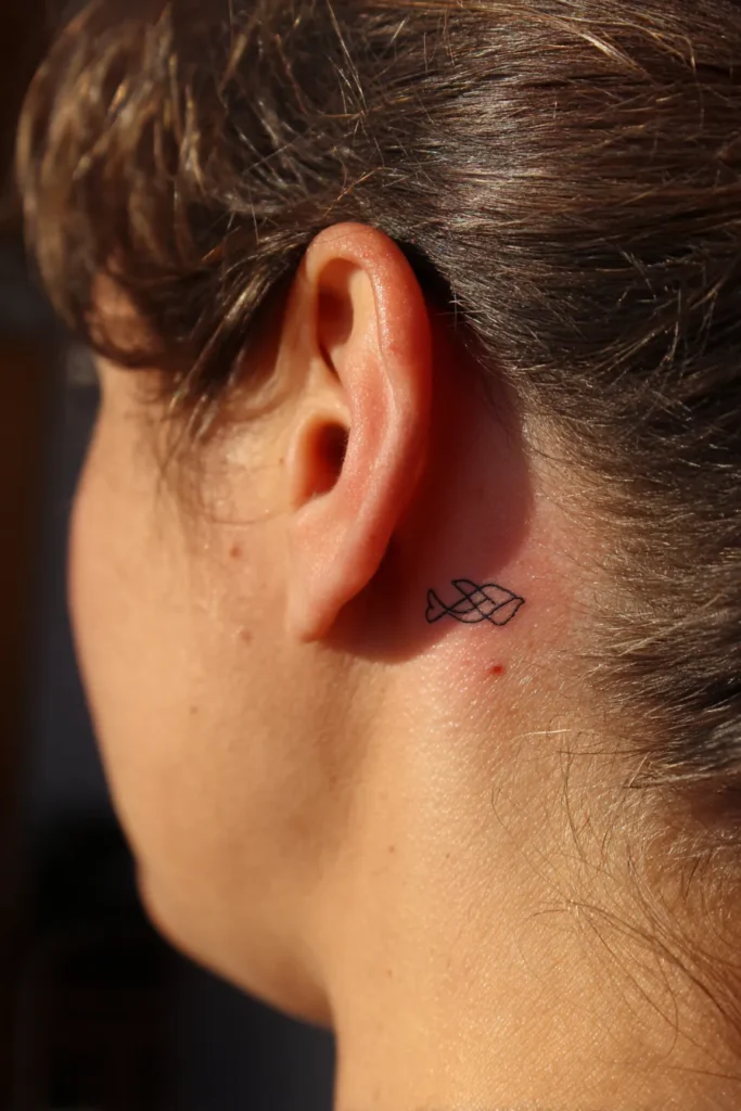 This tiny Christian fish symbol is tucked neatly behind the ear, created with fine black linework that forms a smooth, flowing outline. The design is small and delicate, following the natural curve of the skin just below the ear. There is no shading or added embellishment, just a simple overlapping line that forms the classic ichthys shape. The placement makes it discreet, almost hidden unless the hair is pulled back.