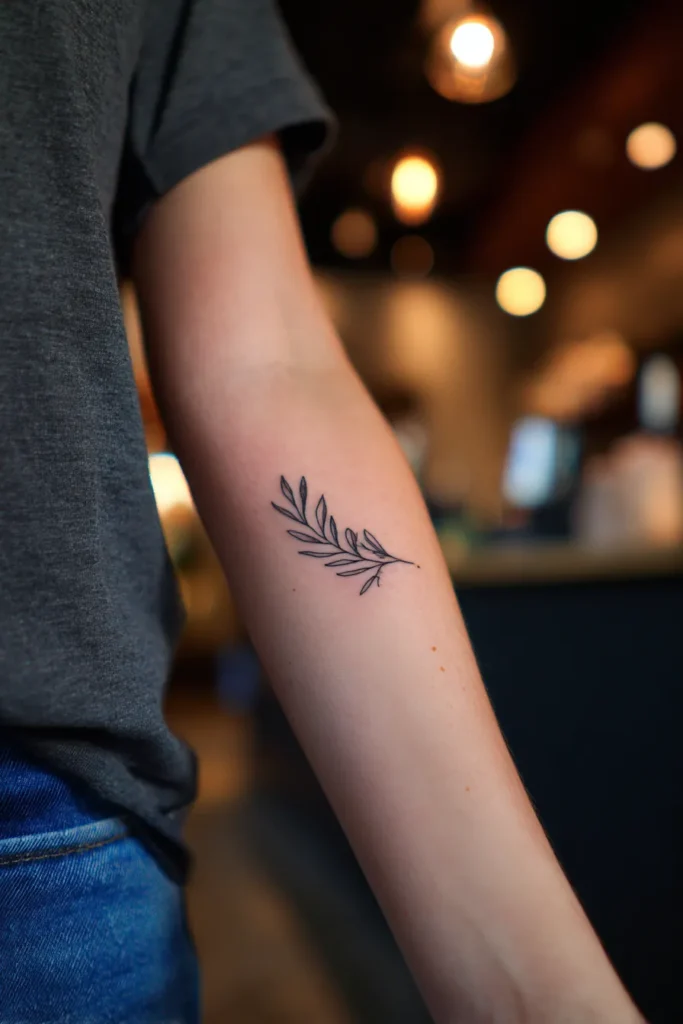 This fine line olive branch tattoo is placed along the outer forearm, following the natural curve of the arm. The design is created in thin black ink with delicate leaves spaced evenly along a slender stem. There is no shading or bold outlining, which keeps the look clean and contemporary. Its medium small size allows it to feel balanced and harmonious without overwhelming the skin.