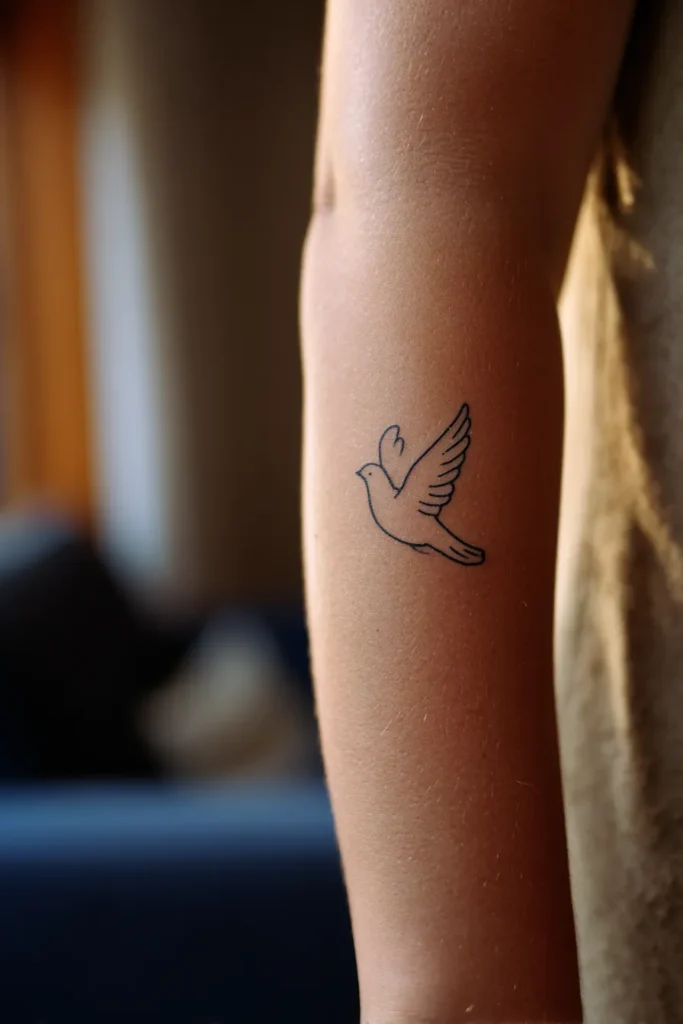 This minimalist dove tattoo is placed on the inner forearm, where the shape can be fully appreciated. The design features a clean line outline of a dove in flight, created with smooth black ink and no heavy shading. The size is modest, giving enough detail to recognize the wings and body while keeping everything light and airy. Its modern fine line style makes the whole piece feel soft and elegant.