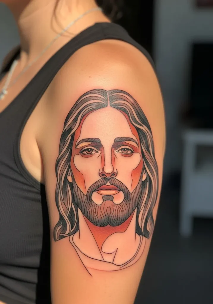 This tattoo features a medium sized modern linework portrait of Jesus placed on the upper arm, using clean black lines with soft muted color accents in the face and hair. The design feels precise and intentional, with smooth contours and gentle shading that give the portrait depth without making it heavy. The placement allows the artwork to flow naturally with the arm, making it visible but still elegant and wearable.