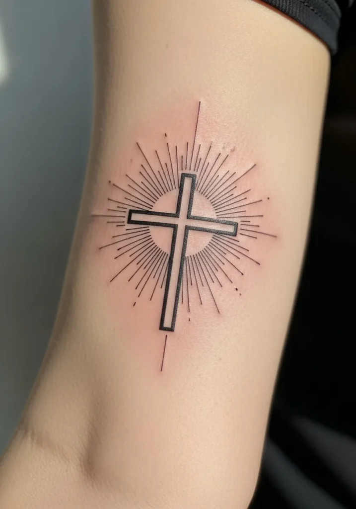 This medium sized linework cross tattoo is placed on the inner forearm, surrounded by fine radiating lines that create a subtle sunburst effect. The cross itself is clean and precise, with soft shading and muted tones that give it depth while staying modern. The placement makes it visible but still refined.