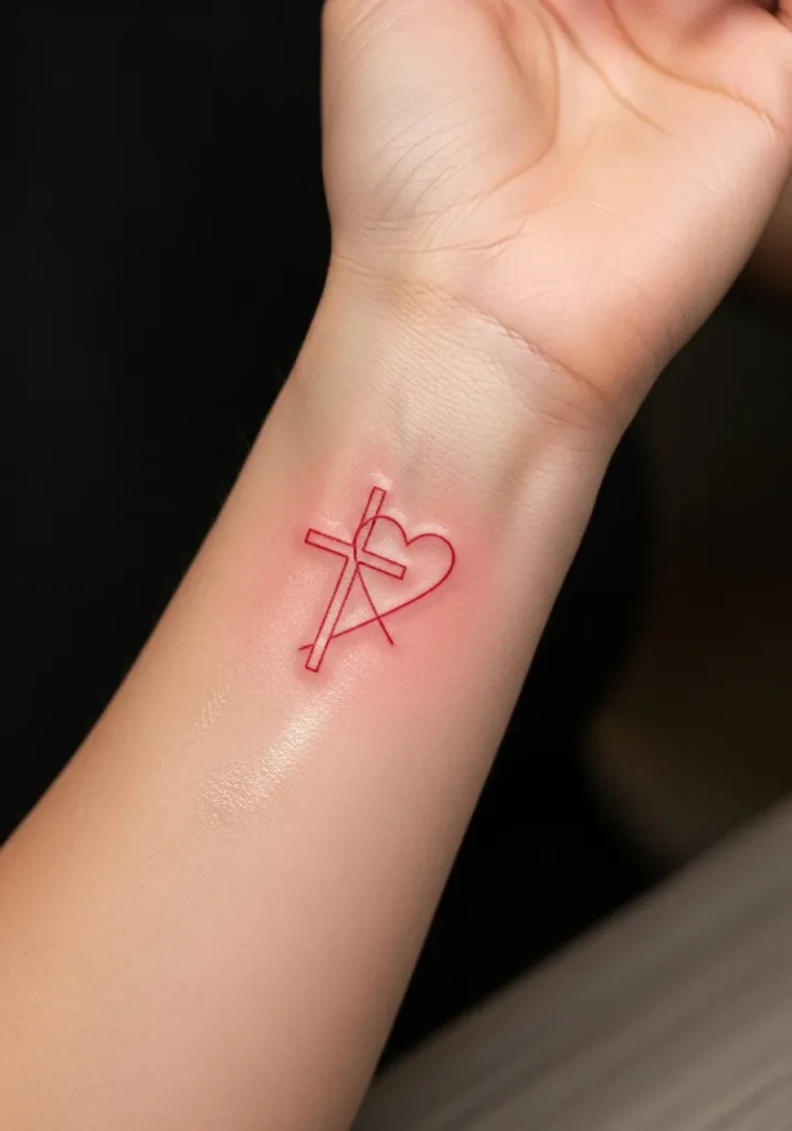 This small modern linework tattoo sits on the inner wrist, blending a heart and cross into one clean continuous design. Thin precise lines and minimal shading keep it elegant and wearable, with a subtle touch of color adding warmth.