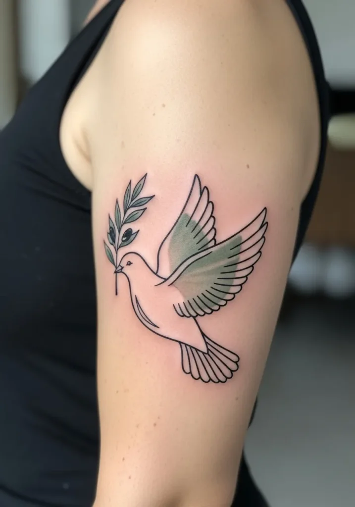 This medium sized linework dove tattoo is placed on the upper arm, featuring clean outlines, soft shading, and gentle color accents in the wings and olive branch. The bird feels light and in motion, with lines that flow naturally along the arm.