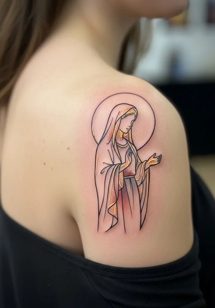 This medium sized modern linework Virgin Mary tattoo sits softly on the upper shoulder, created with clean flowing lines and subtle muted color accents that add warmth to the design. The halo and facial features are minimal yet expressive, giving the tattoo a calm and graceful presence. The placement follows the natural curve of the shoulder, making it feel elegant and well balanced.