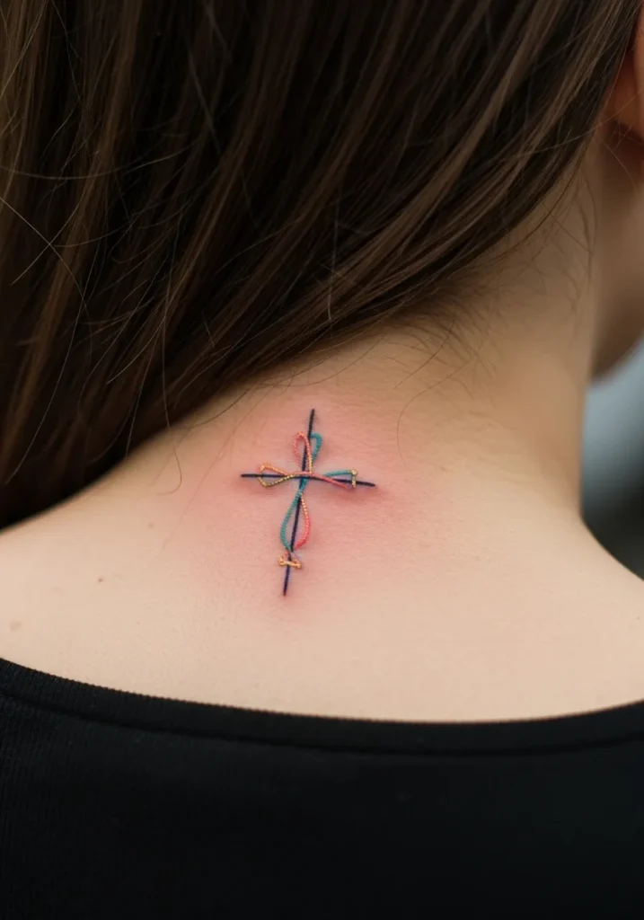This small fine line cross tattoo is placed at the nape of the neck, drawn with ultra clean lines and a hint of soft color that adds depth without overpowering the design. The size keeps it delicate, while the placement makes it feel intimate and quietly meaningful.