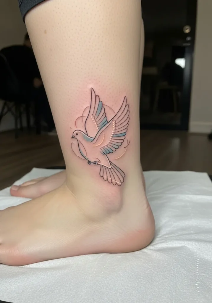 This small fine line dove tattoo sits delicately on the ankle, created with thin black lines and subtle warm tones that soften the overall look. The wings are carefully outlined with precise strokes, giving the tattoo an airy and light feel. Its size and placement make it feel intimate, like a quiet symbol meant just for the wearer.