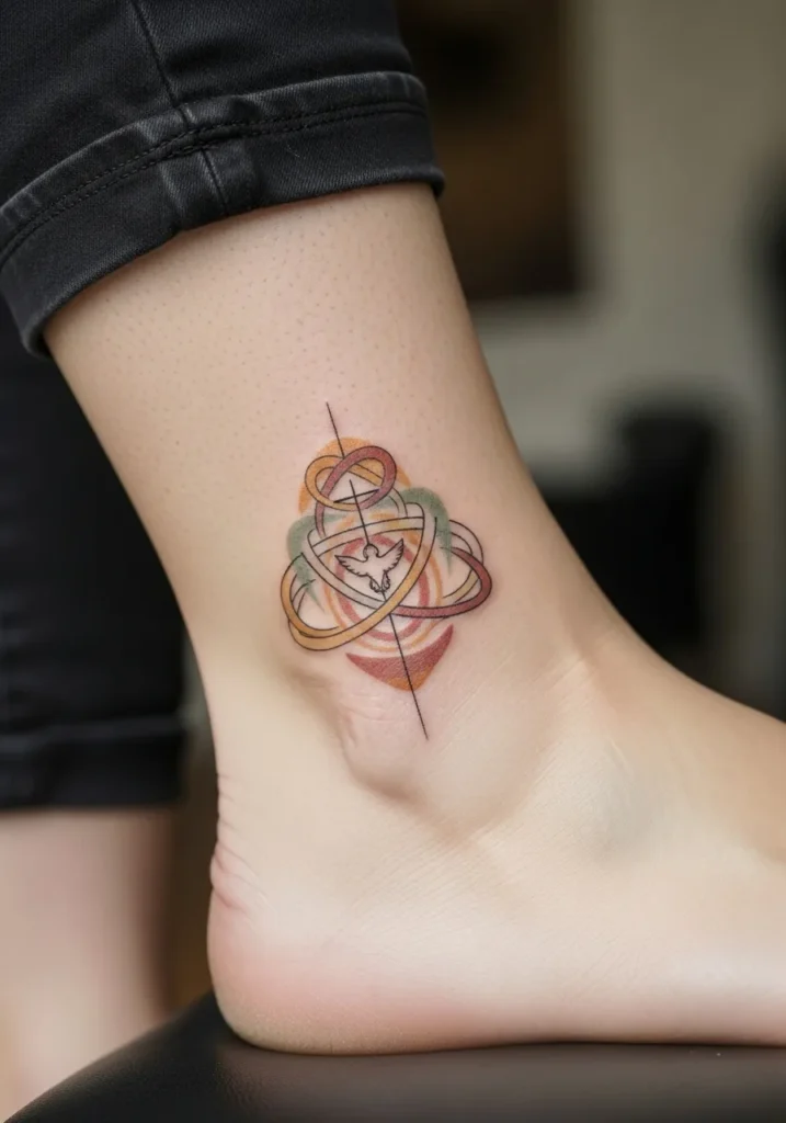 This small modern linework Christian symbol tattoo sits on the ankle, combining clean geometric lines with soft muted color accents in an abstract trinity inspired design. The shapes are precise and balanced, giving it a very intentional and contemporary look.