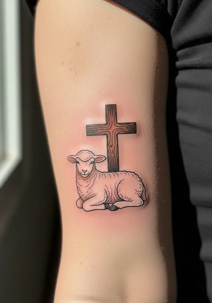 This medium sized linework tattoo features a cross with a small lamb resting at its base, placed on the forearm. Clean outlines and gentle shading give the design depth, while soft color accents keep it warm and approachable rather than heavy.