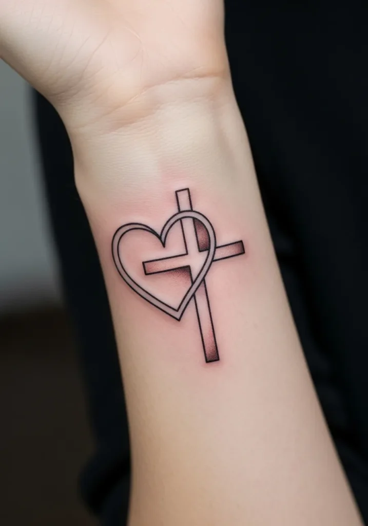 Heart and Cross Linework Wrist Tattoo
