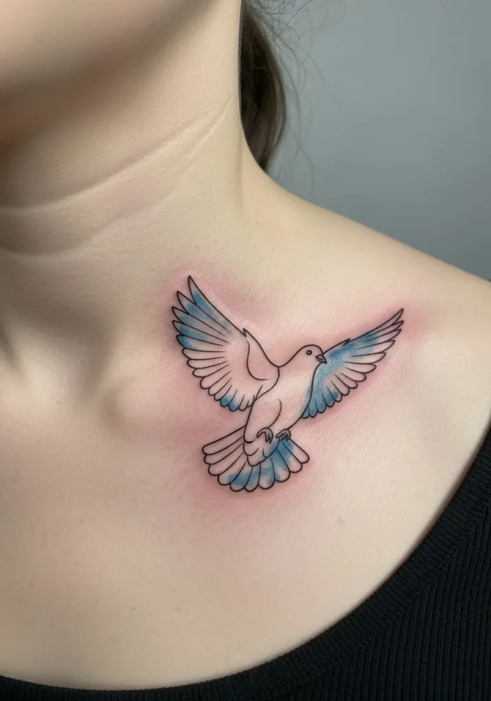 This medium sized linework dove tattoo is placed just below the collarbone, featuring clean outlines and soft pastel color accents in the wings. The dove appears mid flight, giving the design a light and uplifting feel that follows the natural lines of the body.