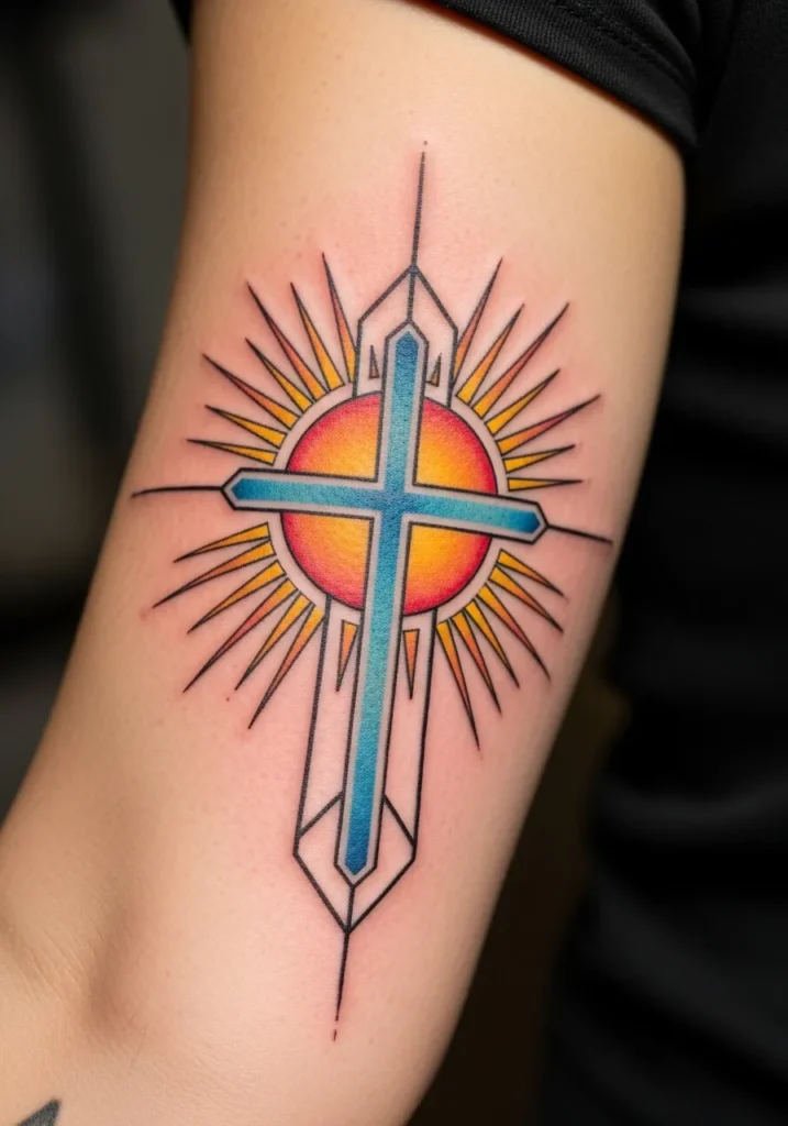 Radiant Cross Color Linework Tattoo