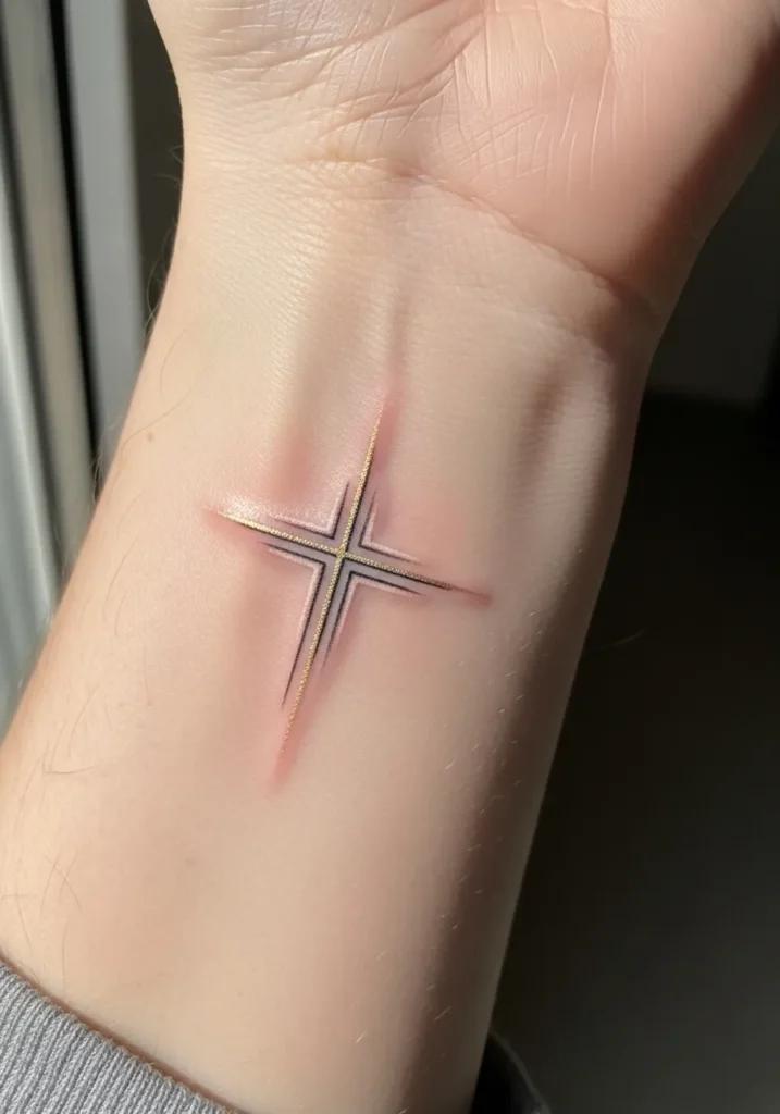 This small modern linework cross tattoo is placed neatly on the inner wrist, designed with ultra clean lines and soft blush toned shading that gives it a gentle glow. The cross feels precise and symmetrical, with subtle color gradients that add depth while keeping the overall look light and refined. The placement makes it easy to wear every day, and the size keeps it elegant rather than overpowering.