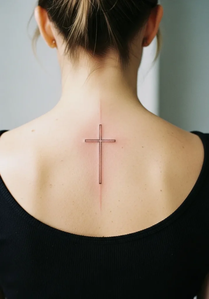 This fine line cross tattoo runs vertically along the upper spine, created with clean black lines and a hint of soft color for warmth. The slim design follows the natural line of the back, keeping it delicate and refined. Its small to medium size makes it feel personal while still visually impactful.