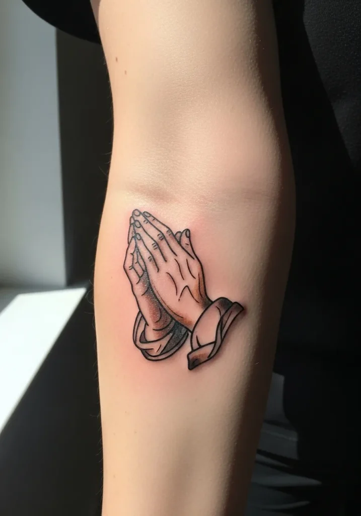 This medium sized praying hands tattoo sits on the inner forearm, created with clean black outlines and gentle shading to add dimension. The lines are crisp and intentional, giving the design a modern look while staying true to the classic symbol. The placement makes it easy to see and feel connected to.