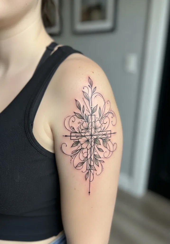 Ornamental Cross Floral Shoulder Tattoo