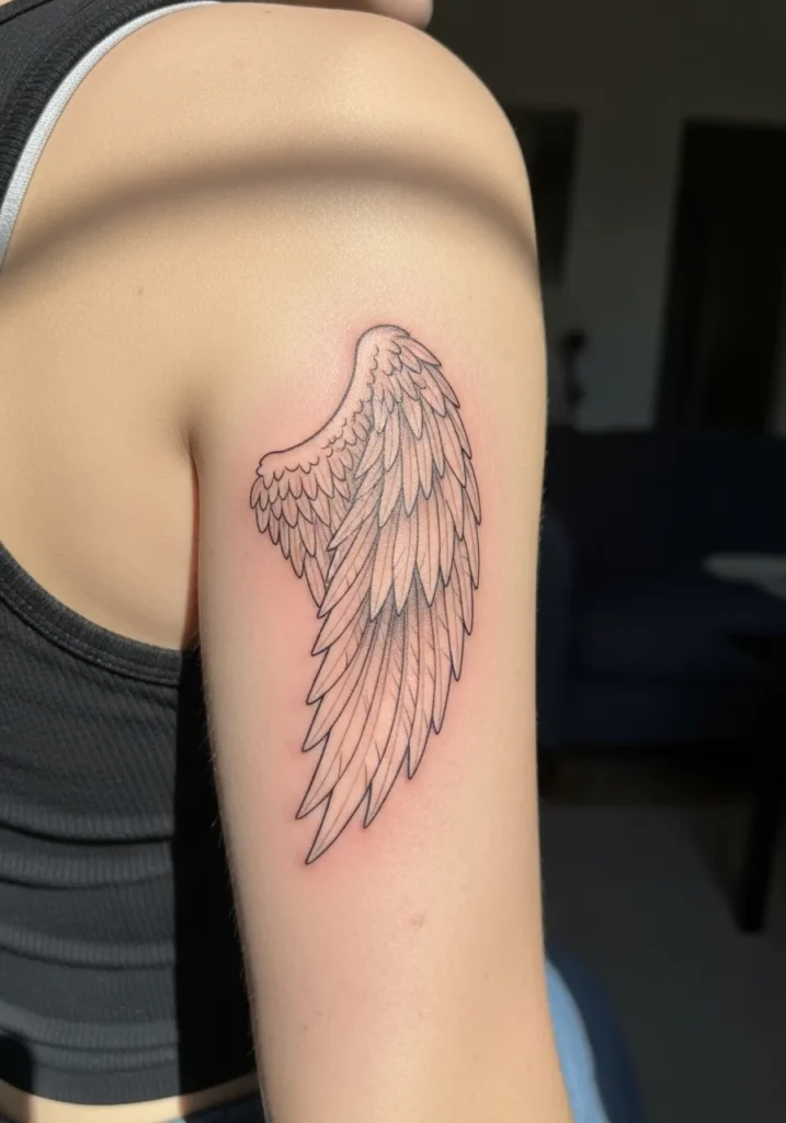 This medium sized angel wing tattoo stretches along the upper arm, created with precise fine lines and soft color shading that adds depth without heaviness. The feathers are detailed but clean, giving the wing a light and flowing appearance that follows the curve of the arm beautifully.
