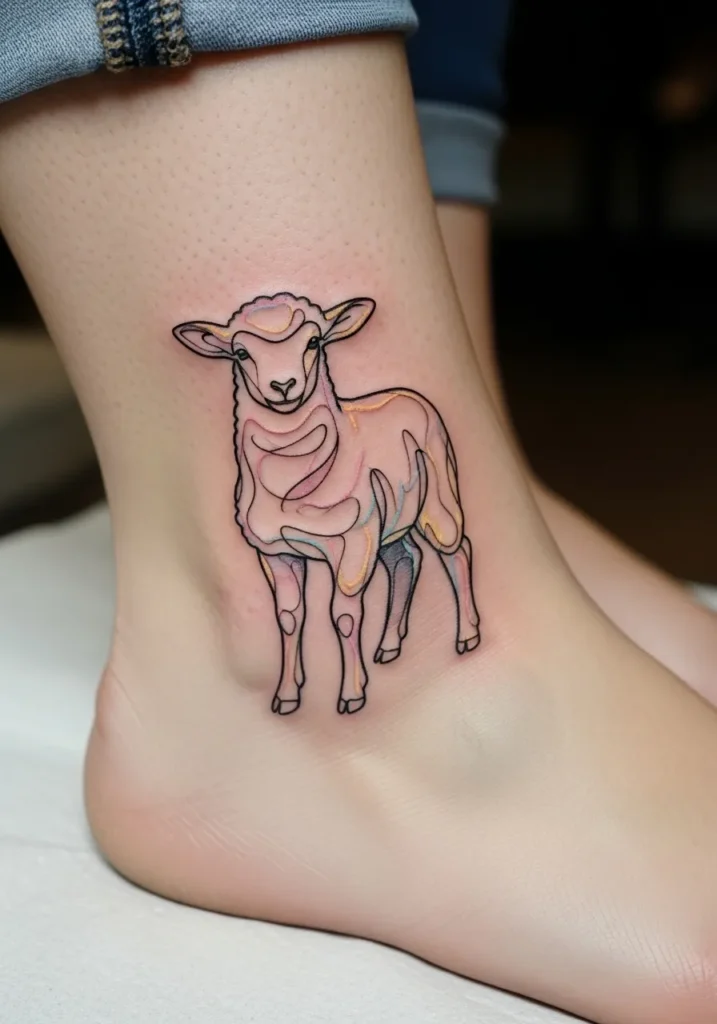 This small modern linework lamb tattoo sits softly on the ankle, drawn with clean black lines and gentle muted color accents that add warmth without overpowering the design. The size keeps it delicate, while the precise outlines give the lamb a calm and almost storybook quality. The placement feels intimate and natural, following the curve of the ankle beautifully.