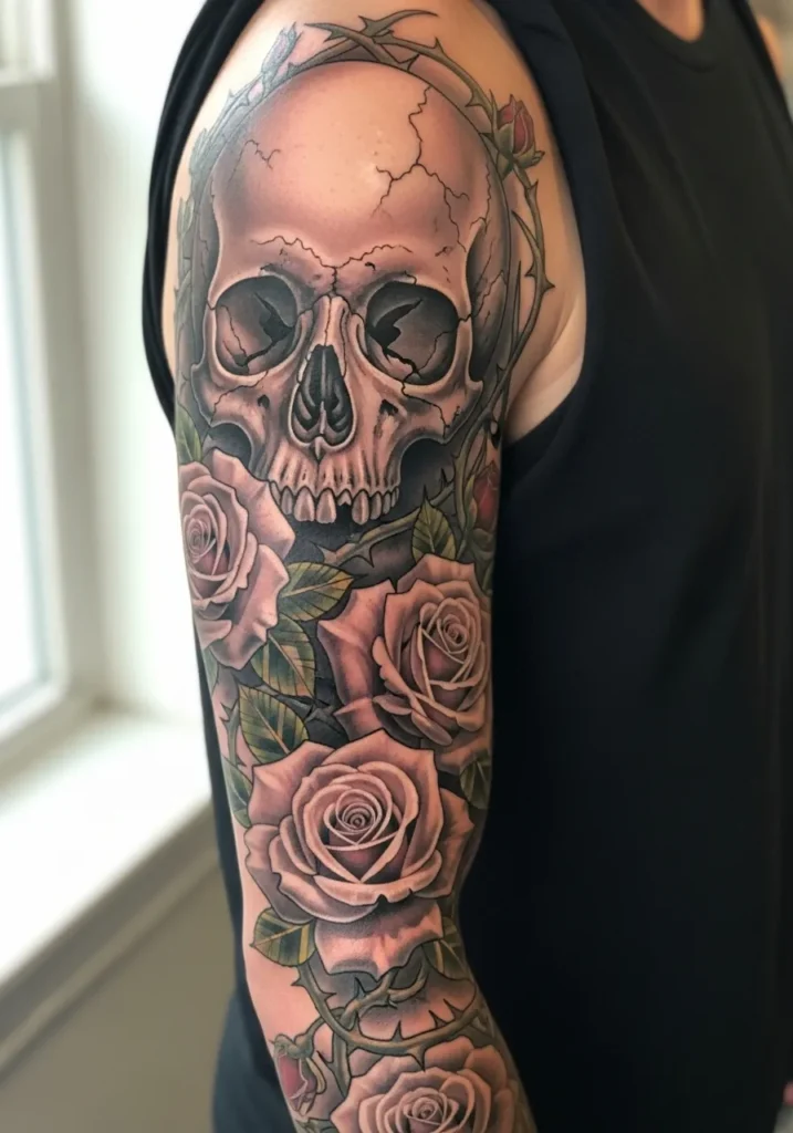 This sleeve features a striking skull surrounded by lush, realistic roses in soft pink tones. The placement runs from shoulder to elbow, blending fine-line shading with bold black and gray contrast. Each rose petal is delicately detailed, while the skull’s cracks and shadows give it a haunting yet artistic realism. The thorns twisting through the composition tie everything together in a beautifully dark way.