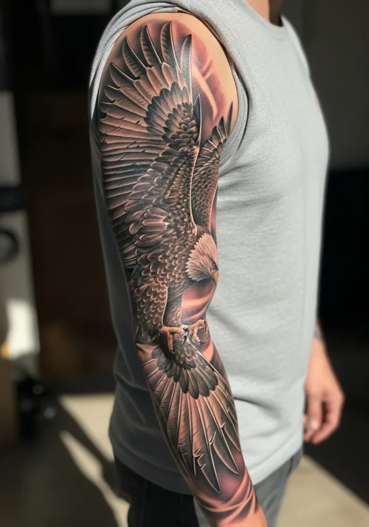 This full sleeve tattoo showcases a majestic bald eagle mid-flight, wings spread wide across the arm with incredible attention to feather detail. The soft blending of gray and bronze tones gives the piece movement and depth, while the wingspan wraps perfectly around the arm for a natural, dynamic effect.