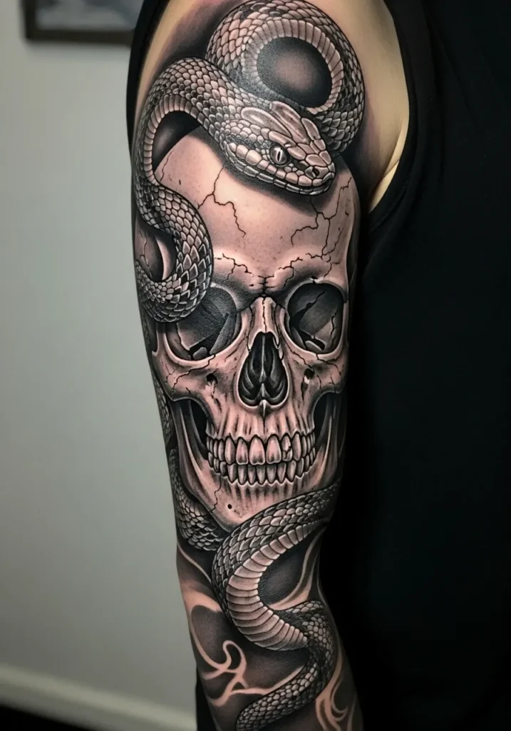 This darkly captivating upper arm piece features a realistic skull entwined by a coiled serpent. The black and gray tones are perfectly balanced, with subtle highlights that make the scales and cracks pop. The placement gives it a smooth flow, making the snake appear to slither around the skull naturally.