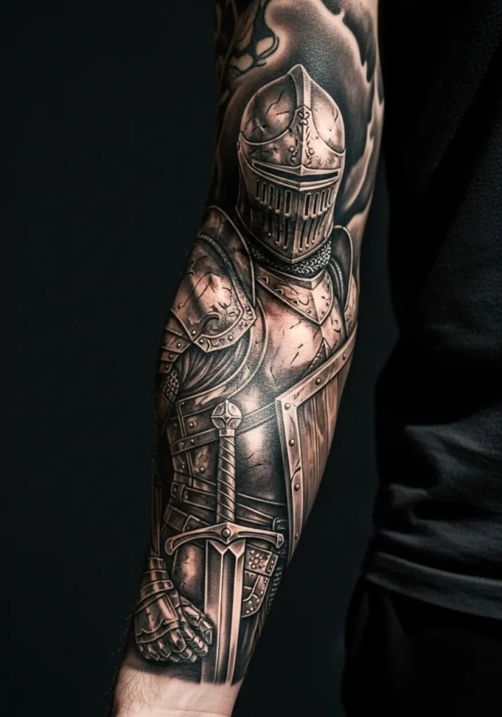 This sleeve tattoo depicts a knight in full armor, rendered with hyper-realistic metal textures and exquisite shading. Every rivet, plate, and reflection is crafted to perfection, giving the impression of a living, breathing warrior. The grayscale palette adds a vintage, heroic tone that fits perfectly on the forearm.