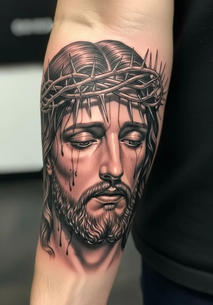 This forearm tattoo portrays a lifelike image of Jesus wearing the crown of thorns, rendered with soft shading and incredible depth. The grayscale tones blend seamlessly to capture every emotion in His eyes, while subtle highlights give the piece a gentle radiance. The placement follows the curve of the arm perfectly, allowing the expression to feel intimate and powerful all at once.