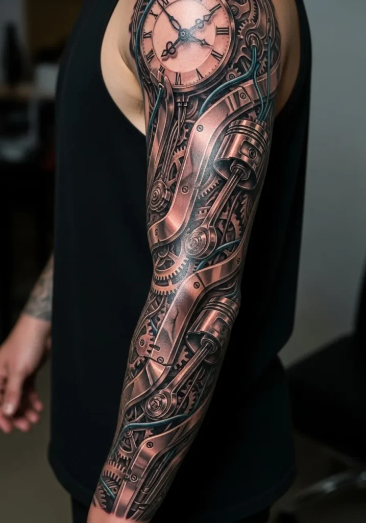 This full-sleeve masterpiece transforms the arm into a complex network of gears, pistons, and metal components that look almost functional. The artist’s use of bronze tones, metallic shading, and mechanical precision gives the illusion of movement under the skin. The large pocket watch on the shoulder ties everything together, adding a timeless centerpiece to the design.