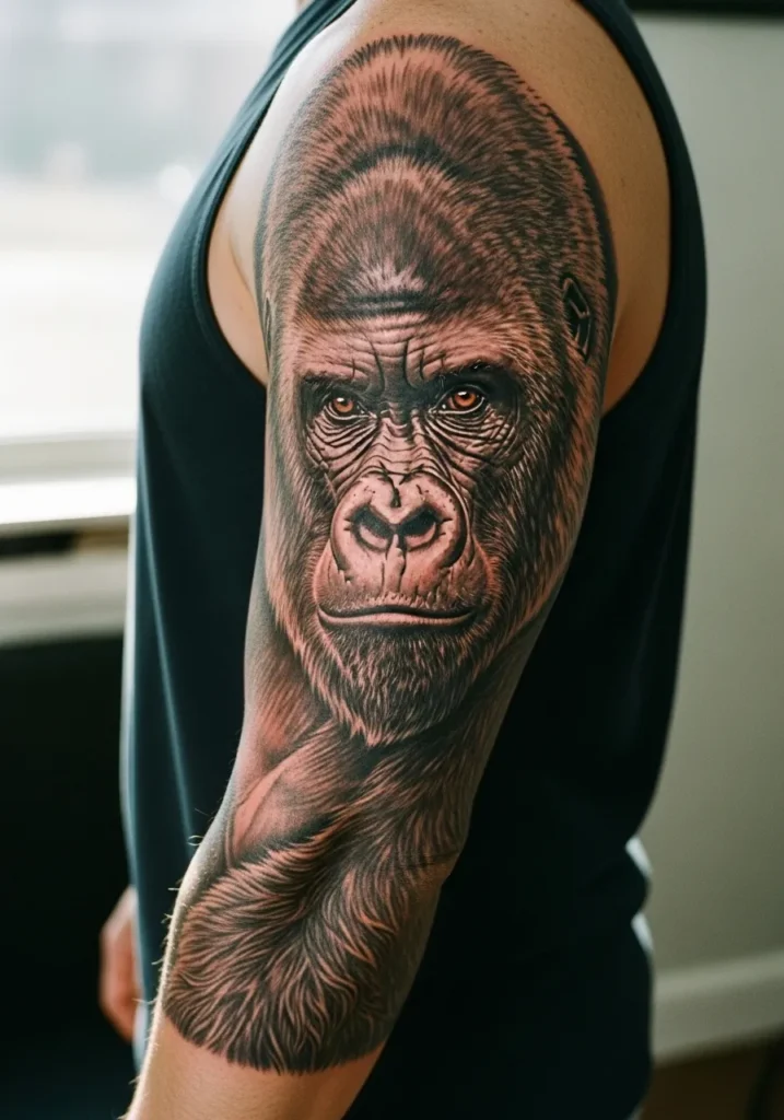 This upper arm tattoo captures the face of a gorilla with breathtaking realism. The shading and texture of the fur look soft enough to touch, while the eyes hold a deep, wise intensity that feels alive. The black and gray tones give it a dramatic, almost portrait-like presence that stands strong on the arm.