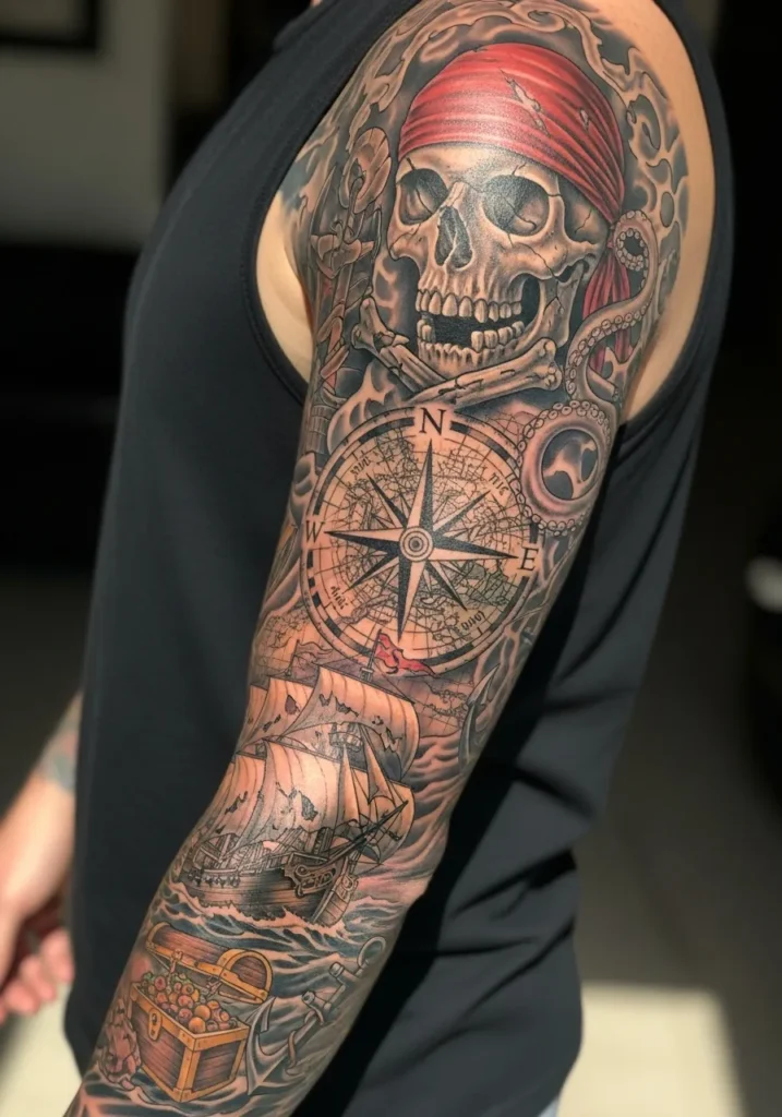 This adventure-filled sleeve features a skull pirate wearing a red bandana, surrounded by a compass, treasure chest, and a ship sailing through stormy seas. Every element is rendered in striking realism, with warm bronze and gray tones that make it feel like an old treasure map brought to life. The composition flows beautifully from shoulder to wrist, telling a story across the skin.