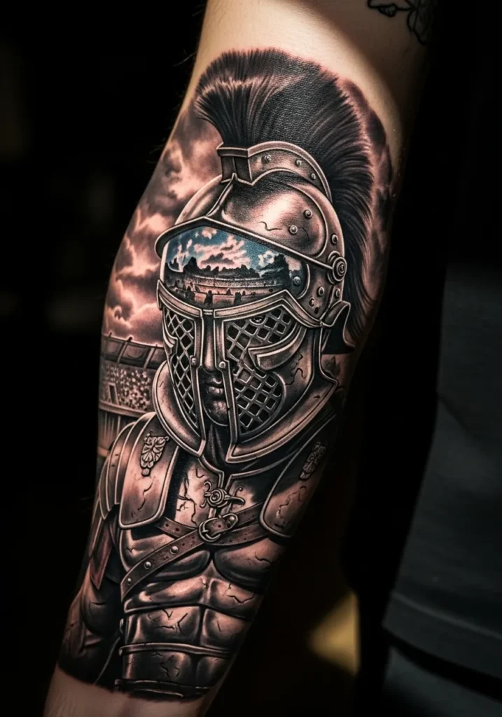 This forearm tattoo shows a Roman gladiator in full armor, standing ready for battle with the reflection of the arena glinting in his helmet. The grayscale shading, tiny armor details, and atmospheric lighting make it look straight out of a movie scene. Every crack and highlight adds to the realism, giving it that battle-worn authenticity.