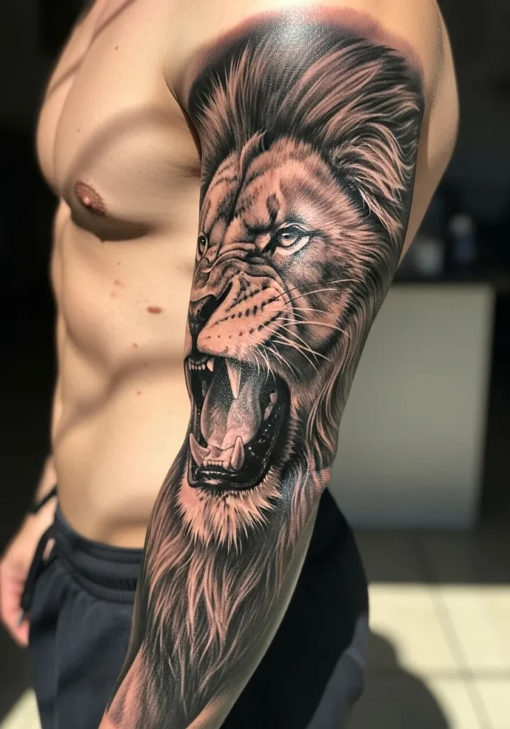 This sleeve showcases a roaring lion captured mid-snarl, with fur so realistic it feels alive. The gradient shading and bold highlights make every hair strand pop, while the intense expression radiates strength and pride. The design hugs the arm naturally, giving it a fierce and dynamic flow.